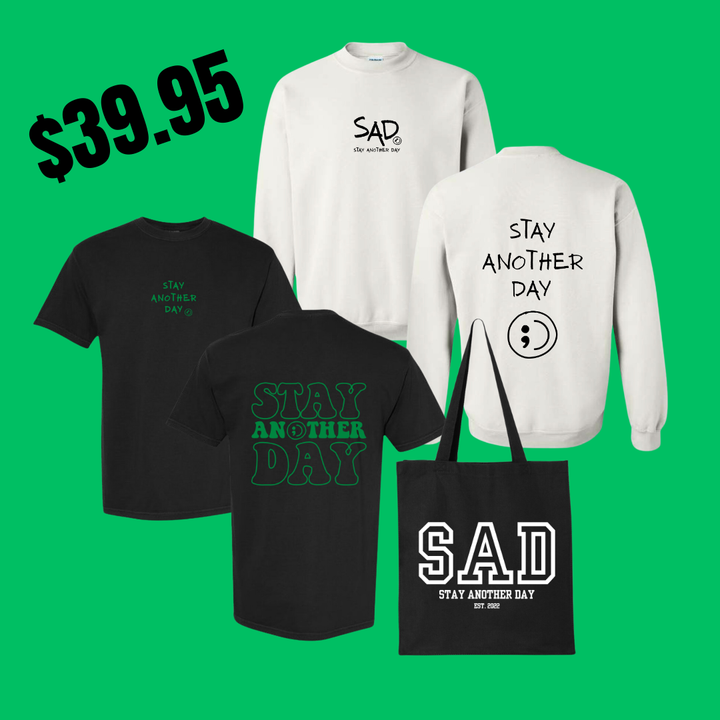 This bundle includes a white crewneck with Stay Another Day print, Black tshirt with Stay Another Day plus a black over sized tote bag with SAD Established print. All items as pictured. This bundle is not customizable, and will only be available while supplies last. Limited Supply of each size $39.95 (Discounts do not apply to this item).