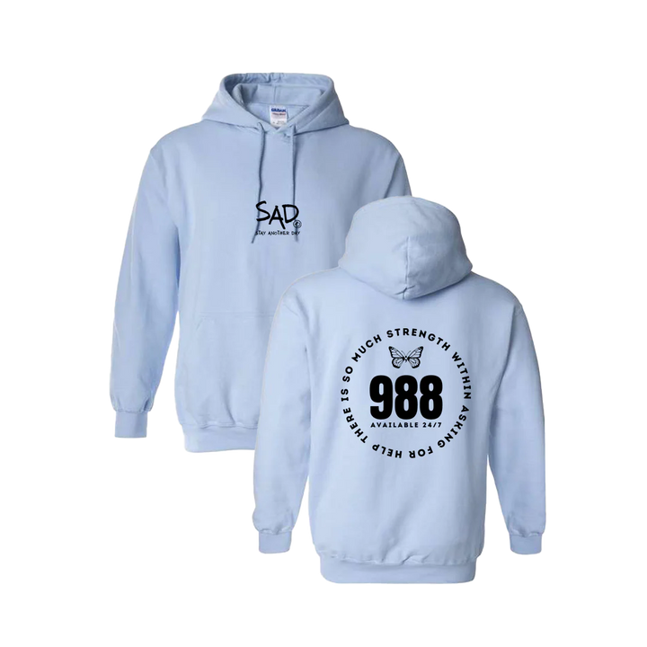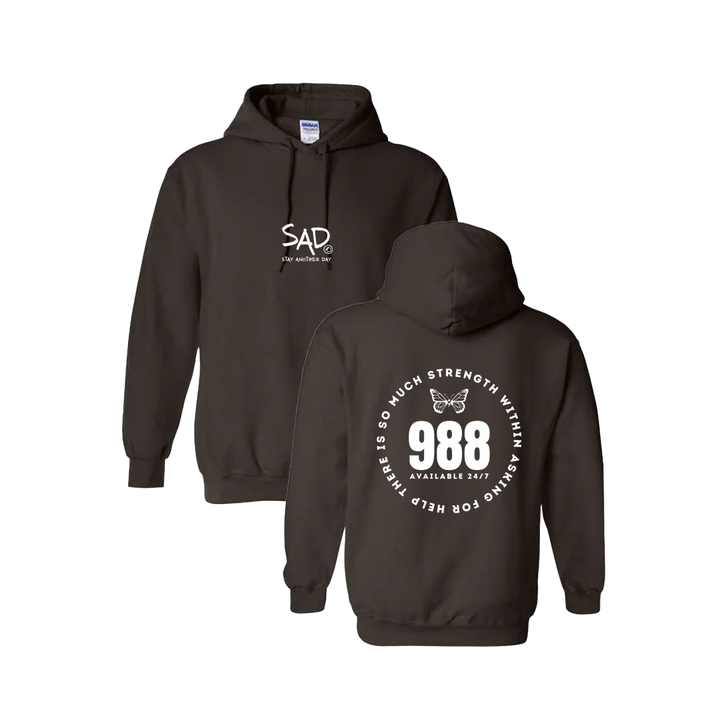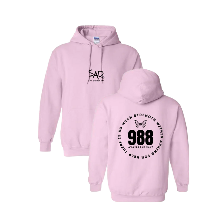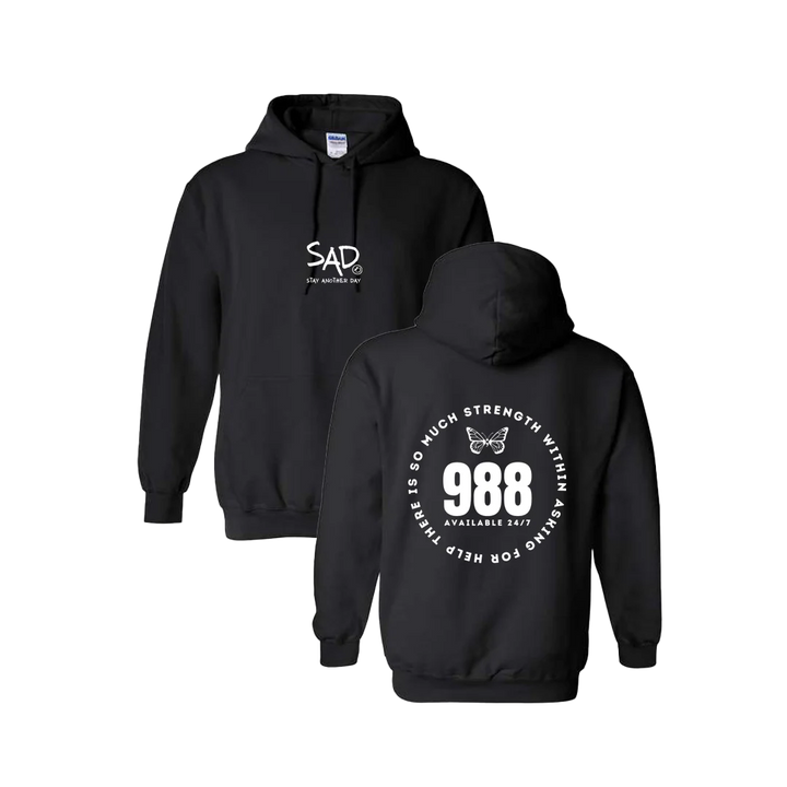 There is So Much Strength Within Asking for Help - 988 Screen Printed Butterfly Hoodie. This super comfortable Hoodie features the small SAD logo on the front with the Stay Another Day text below, as well as the large 988 design print on the back.