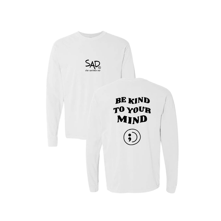 Be Kind To Your Mind White T-shirt screen printed design. This super comfortable Long Sleeve Tee features the small SAD logo on the front with the Stay Another Day text below, as well as the larger Be Kind To Your Mind Bubble Print text on the back.