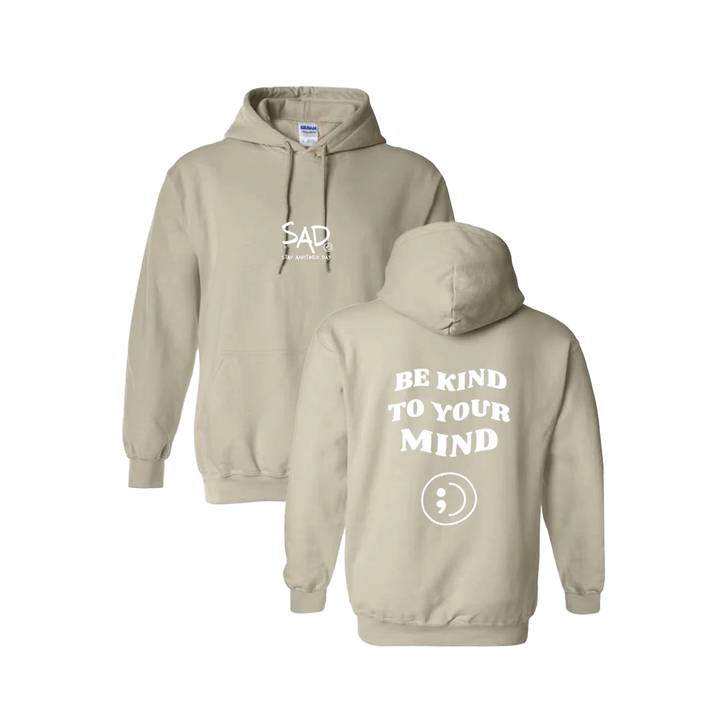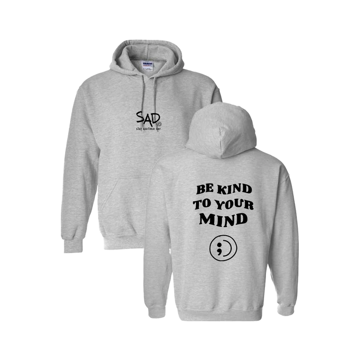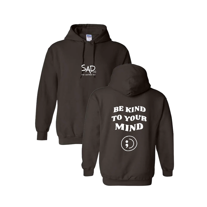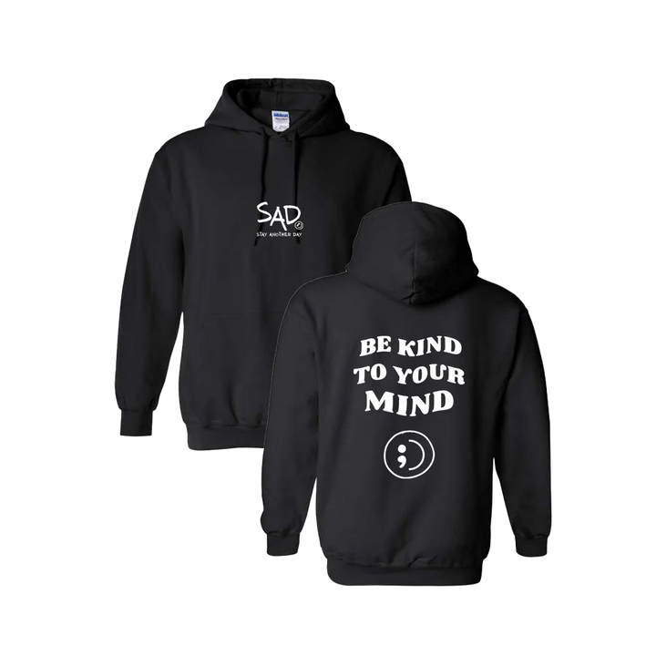 Be Kind To Your Mind hoodie screen printed design. This super comfortable hoodie features the small SAD logo on the front with the Stay Another Day text below, as well as the larger Be Kind To Your Mind Bubble Print text on the back.