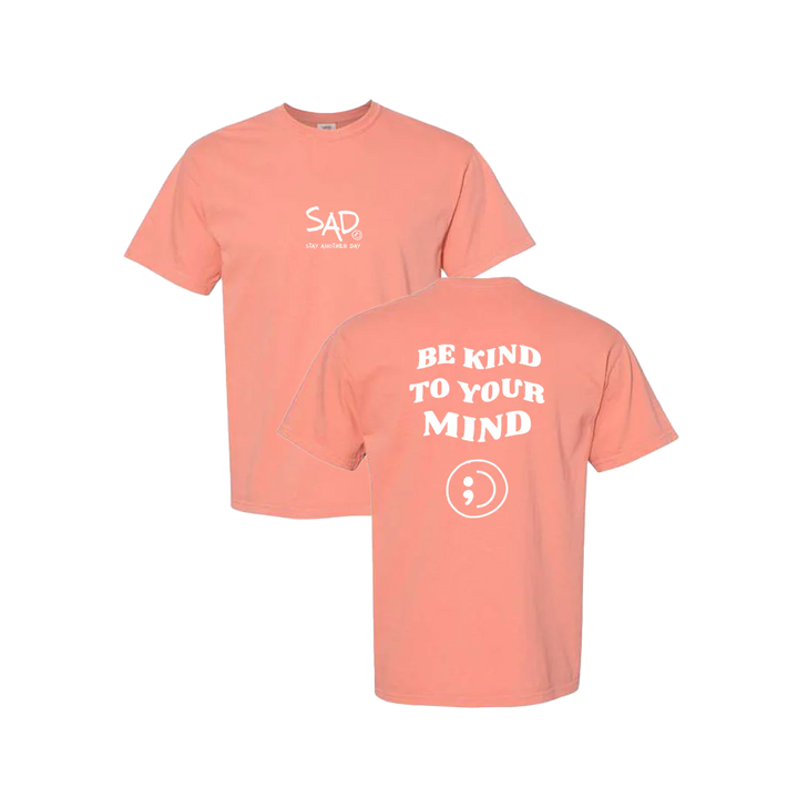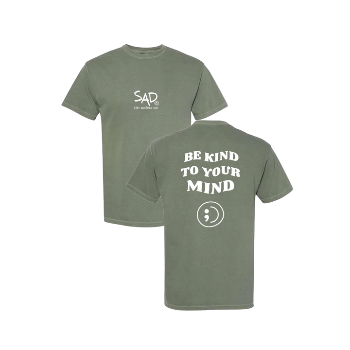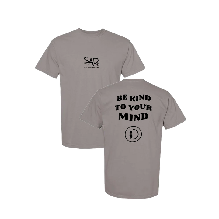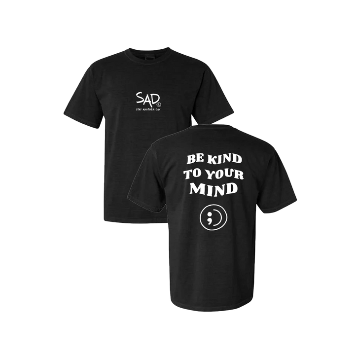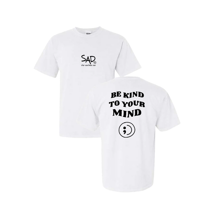 Be Kind To Your Mind T-shirt screen printed design. This super comfortable T-shirt features the small SAD logo on the front with the Stay Another Day text below, as well as the larger Be Kind To Your Mind Bubble Print text on the back