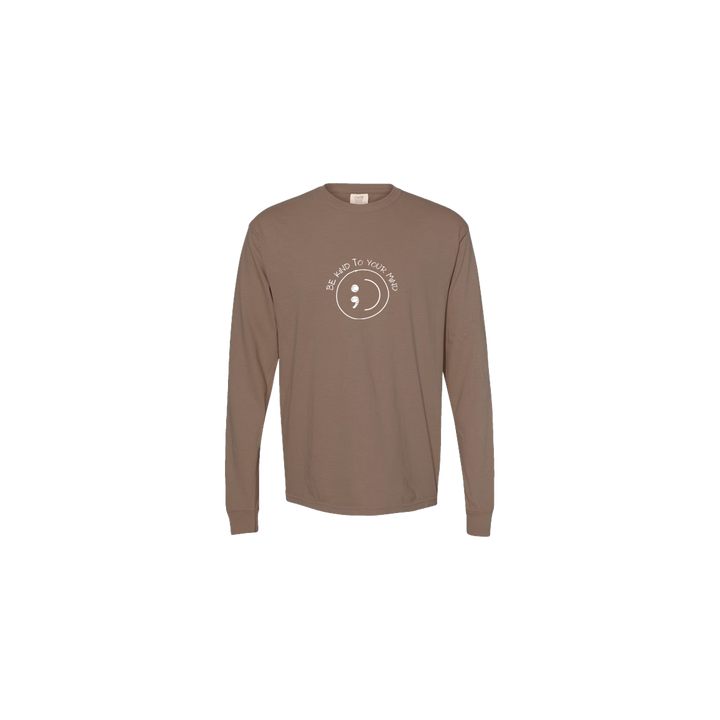 Be Kind To Your Mind Smiley Face Embroidered on a Brown Long Sleeve Tshirt. This super comfortable Long Sleeve Tshirt features the Be Kind To Your Mind Smiley Face design, centered on the front chest.
