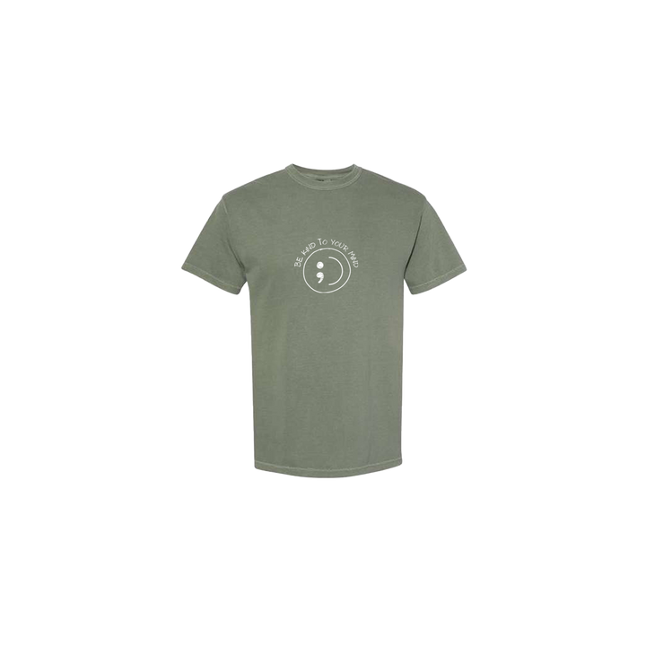Be Kind To Your Mind Smiley Face Embroidered on a Army Green Tshirt. This super comfortable Tshirt features the Be Kind To Your Mind Smiley Face design, centered on the front chest.