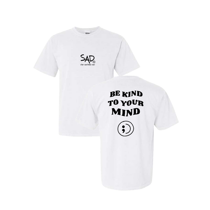 Be Kind To Your Mind White T-shirt screen printed design. This super comfortable T-shirt features the small SAD logo on the front with the Stay Another Day text below, as well as the larger Be Kind To Your Mind Bubble Print text on the back.