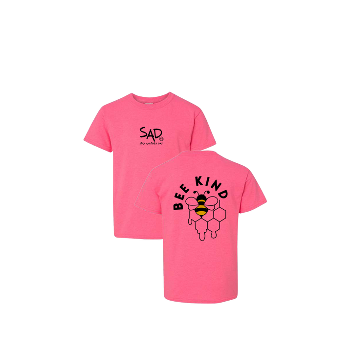 Bee Kind - Honey Bee Safety Pink youth Tshirt. This super comfortable Tshirt features the small SAD logo on the front with the Stay Another Day text below, as well as the Larger Honey Bee - Bee Kind design on the back.