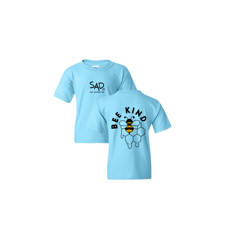 Bee Kind - Honey Bee Sky Blue youth Tshirt. This super comfortable Tshirt features the small SAD logo on the front with the Stay Another Day text below, as well as the Larger Honey Bee - Bee Kind design on the back.