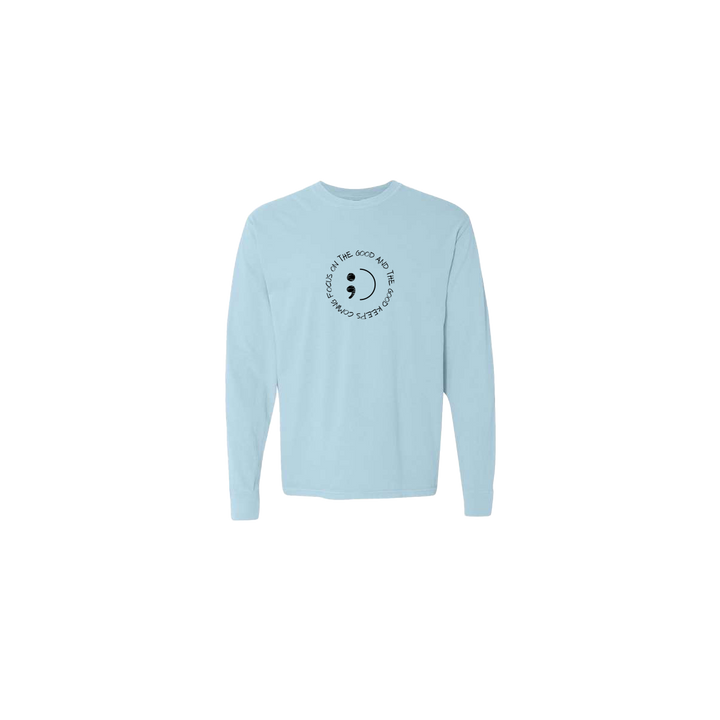 Focus On The Good and The Good Keeps Coming Smiley text Embroidered on a Light Blue Long Sleeve Tshirt. This super comfortable Long Sleeve Tshirt features the Focus on the Good smiley design, centered on the front chest.