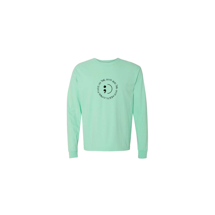 Focus On The Good and The Good Keeps Coming Smiley text Embroidered on a Mint Long Sleeve Tshirt. This super comfortable Long Sleeve Tshirt features the Focus on the Good smiley design, centered on the front chest.