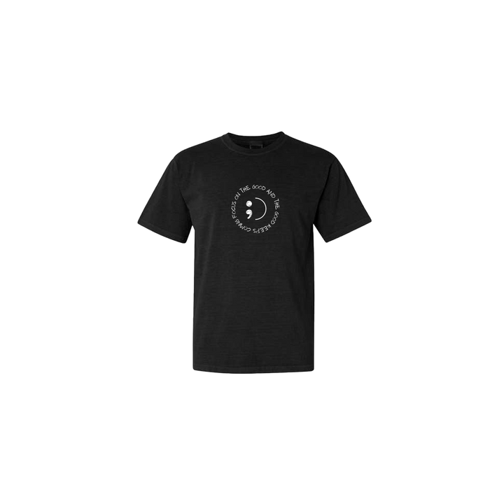 Focus On The Good and The Good Keeps Coming Smiley text Embroidered on a Black Tshirt. This super comfortable Tshirt features the Focus on the Good smiley design, centered on the front chest.