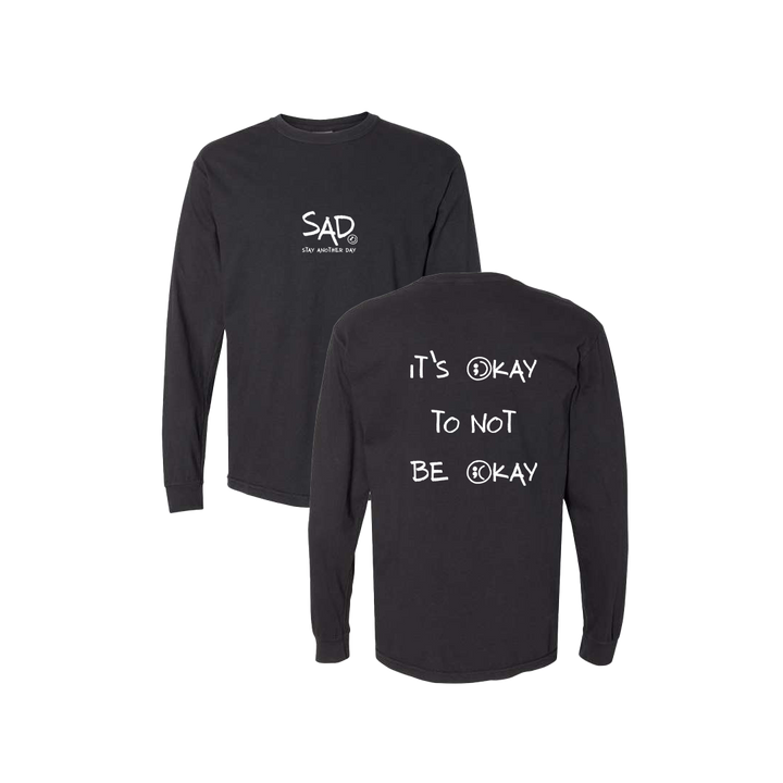 It's Okay To Not Be Okay Black T-shirt screen printed design. This super comfortable Long Sleeve Tee features the small SAD logo on the front with the Stay Another Day text below, as well as the larger It's Okay To Not Be Okay Bubble Print text on the back.
