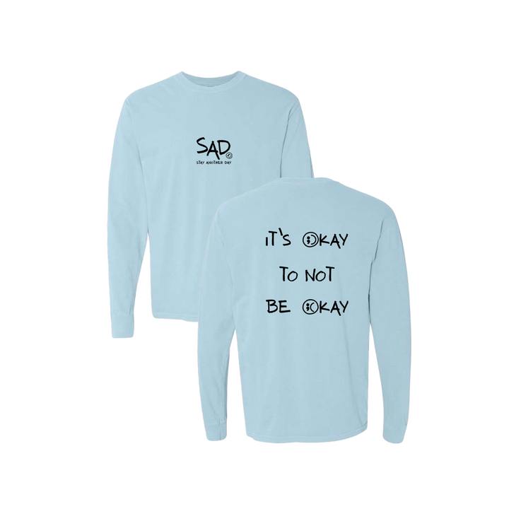 It's Okay To Not Be Okay Blue T-shirt screen printed design. This super comfortable Long Sleeve Tee features the small SAD logo on the front with the Stay Another Day text below, as well as the larger It's Okay To Not Be Okay Bubble Print text on the back.