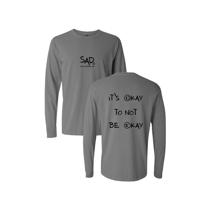 It's Okay To Not Be Okay Grey T-shirt screen printed design. This super comfortable Long Sleeve Tee features the small SAD logo on the front with the Stay Another Day text below, as well as the larger It's Okay To Not Be Okay Bubble Print text on the back.