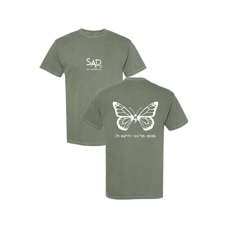 Butterfly with I'm Happy You're Here text screen printed design Army Green T-shirt. This super comfortable T-shirt features the small SAD logo on the front with the Stay Another Day text below, as well as the larger Butterfly print with text on the back.