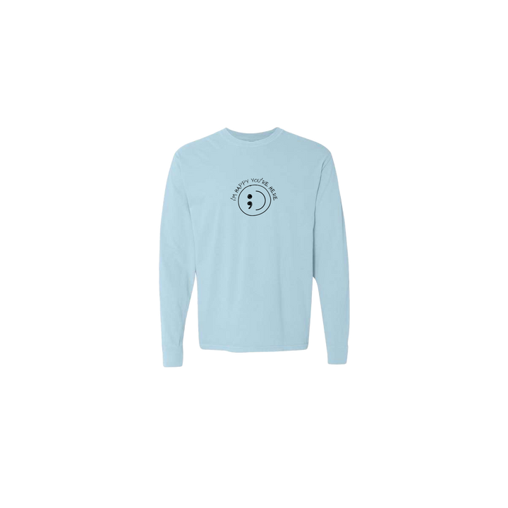 I'm Happy You're Here Embroidered Light Blue Long Sleeve Tshirt - Mental Health Awareness Clothing