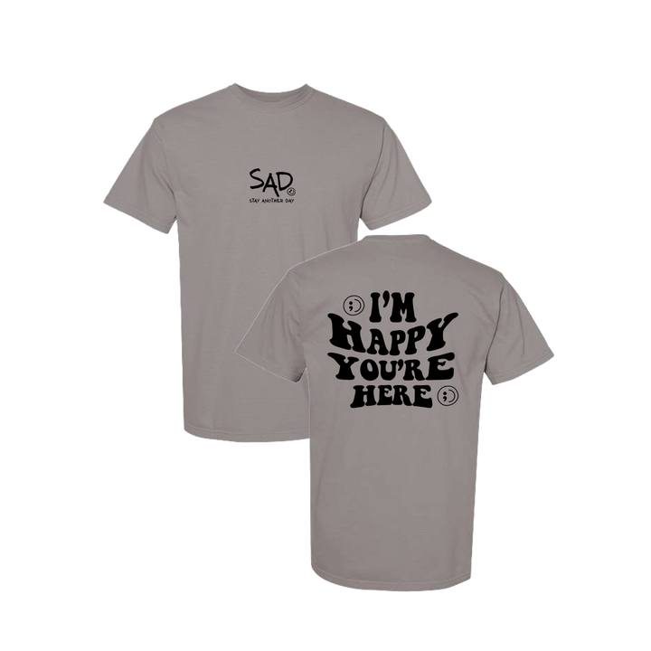 I'm Happy You're Here Grey T-shirt screen printed design. This super comfortable T-shirt features the small SAD logo on the front with the Stay Another Day text below, as well as the larger I'm Happy You're Here Bubble Print text on the back.