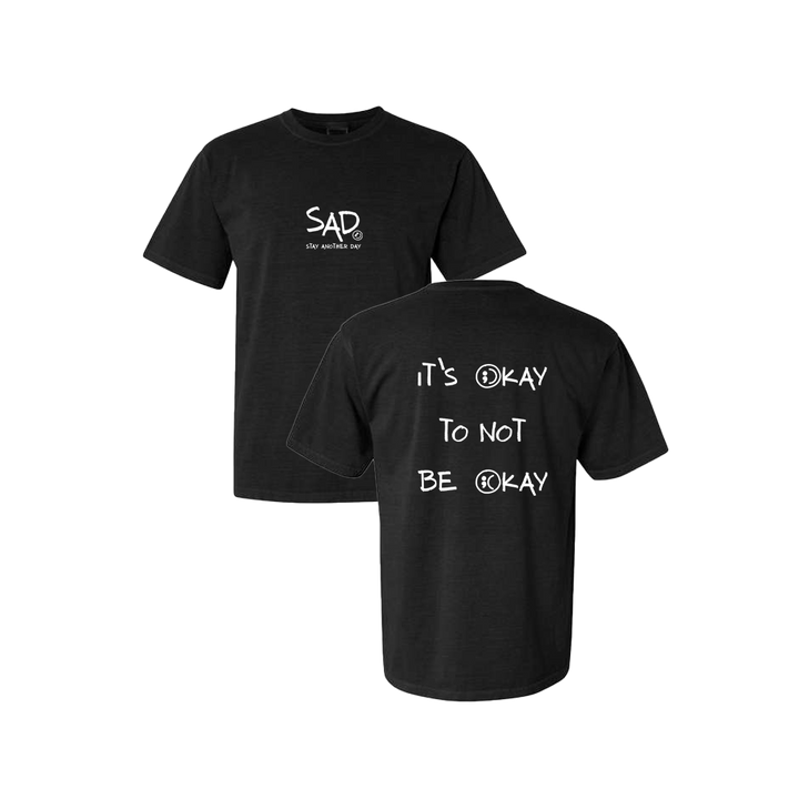 It's Okay To Not Be Okay Black T-shirt screen printed design. This super comfortable T-shirt features the small SAD logo on the front with the Stay Another Day text below, as well as the larger It's Okay To Not Be Okay Bubble Print text on the back.