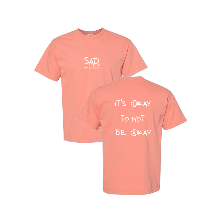 It's Okay To Not Be Okay Coral T-shirt screen printed design. This super comfortable T-shirt features the small SAD logo on the front with the Stay Another Day text below, as well as the larger It's Okay To Not Be Okay Bubble Print text on the back.