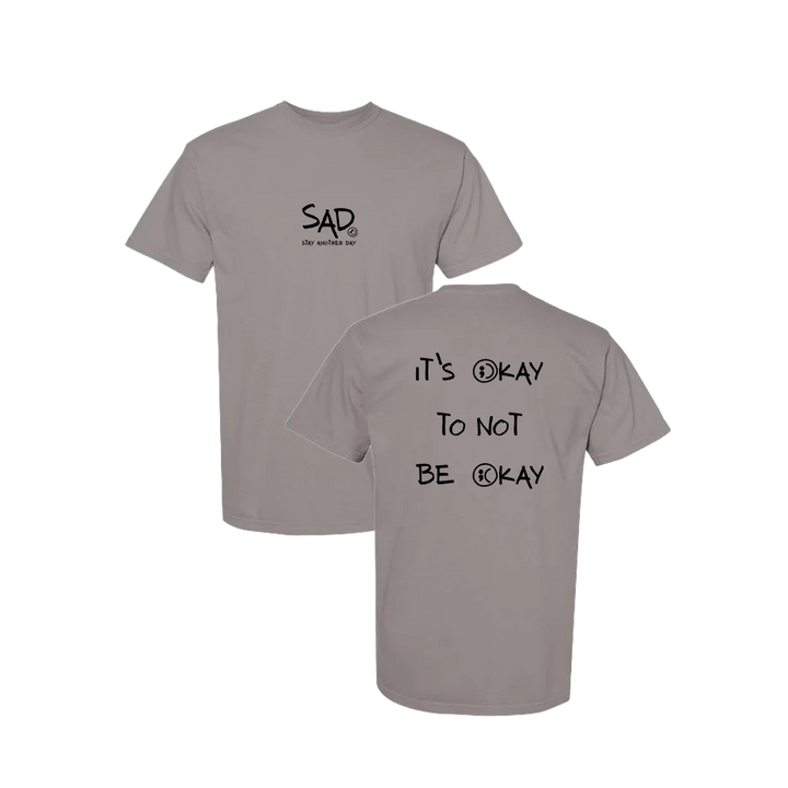 It's Okay To Not Be Okay T-shirt screen printed design. This super comfortable T-shirt features the small SAD logo on the front with the Stay Another Day text below, as well as the larger It's Okay To Not Be Okay Bubble Print text on the back.
