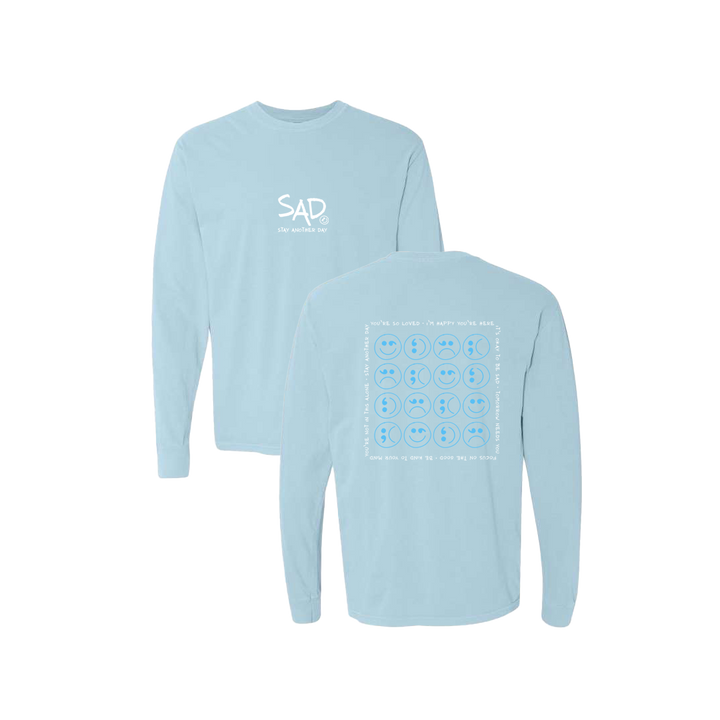 Smiley Face - Sad Face Blue Multi Design Blue Long Sleeve Tee. This super comfortable Long Sleeve Tee features the small SAD logo on the front with the Stay Another Day text below, as well as the larger Blue Multi Smiley design on the back.