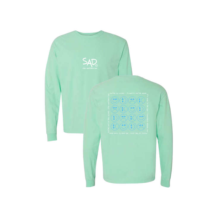 Smiley Face - Sad Face Blue Multi Design Mint Long Sleeve Tee. This super comfortable Long Sleeve Tee features the small SAD logo on the front with the Stay Another Day text below, as well as the larger Blue Multi Smiley design on the back.