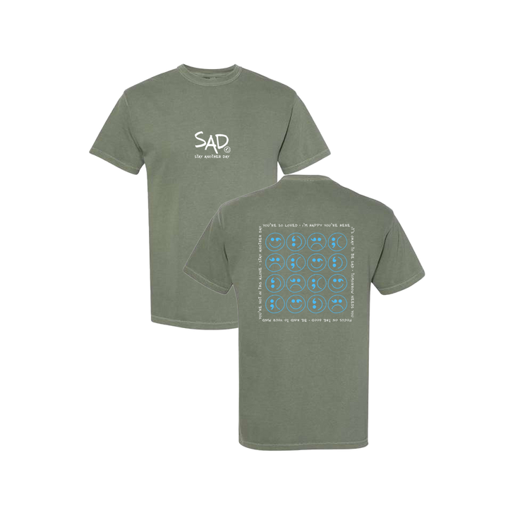 Smiley Face - Sad Face Blue Multi Design Army Green T-shirt. This super comfortable T-shirt features the small SAD logo on the front with the Stay Another Day text below, as well as the larger Blue Multi Smiley design on the back.