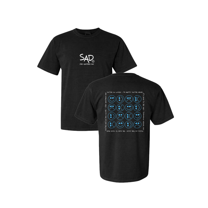 Smiley Face - Sad Face Blue Multi Design Black T-shirt. This super comfortable T-shirt features the small SAD logo on the front with the Stay Another Day text below, as well as the larger Blue Multi Smiley design on the back.