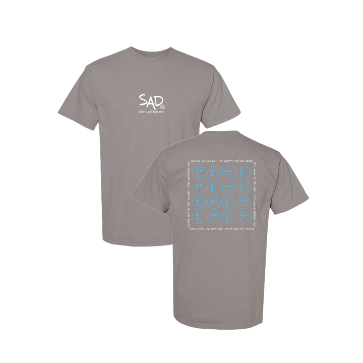 Smiley Face - Sad Face Blue Multi Design Grey T-shirt. This super comfortable T-shirt features the small SAD logo on the front with the Stay Another Day text below, as well as the larger Blue Multi Smiley design on the back.