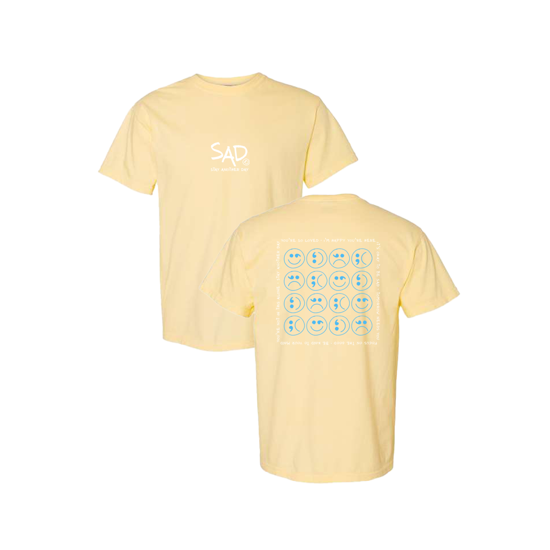 Smiley Face - Sad Face Blue Multi Design Yellow T-shirt. This super comfortable T-shirt features the small SAD logo on the front with the Stay Another Day text below, as well as the larger Blue Multi Smiley design on the back.