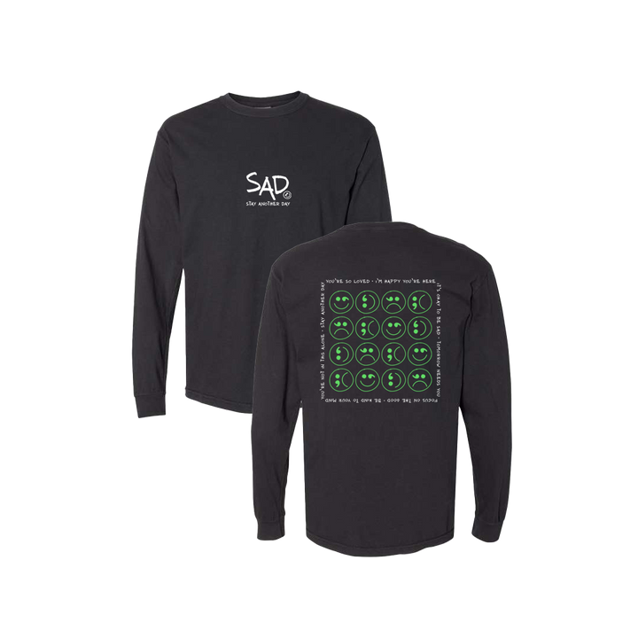 Smiley Face - Sad Face Green Multi Design Black Long Sleeve Tee. This super comfortable Long Sleeve Tee features the small SAD logo on the front with the Stay Another Day text below, as well as the larger Green Multi Smiley design on the back.