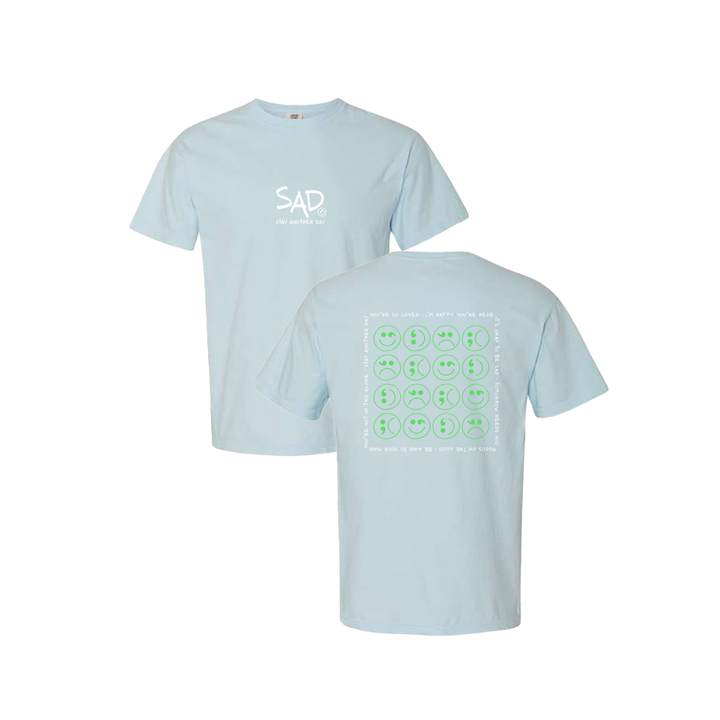 Smiley Face - Sad Face Green Multi Design Blue T-shirt. This super comfortable T-shirt features the small SAD logo on the front with the Stay Another Day text below, as well as the larger Green Multi Smiley design on the back.
