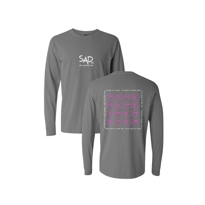Smiley Face - Sad Face Pink Multi Design Grey Long Sleeve Tee. This super comfortable Long Sleeve Tee features the small SAD logo on the front with the Stay Another Day text below, as well as the larger Pink Multi Smiley design on the back.