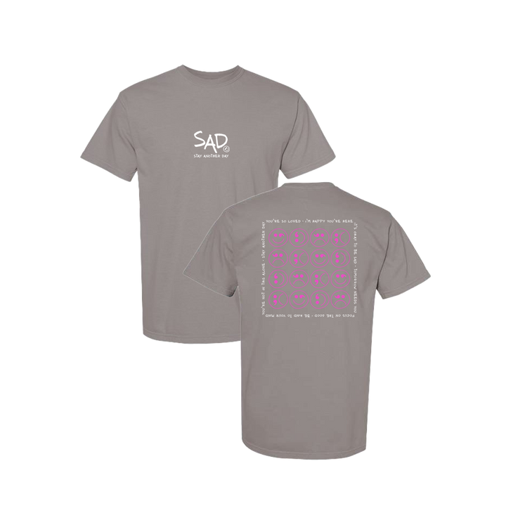 Smiley Face - Sad Face Pink Multi Design Grey T-shirt. This super comfortable T-shirt features the small SAD logo on the front with the Stay Another Day text below, as well as the larger Pink Multi Smiley design on the back.