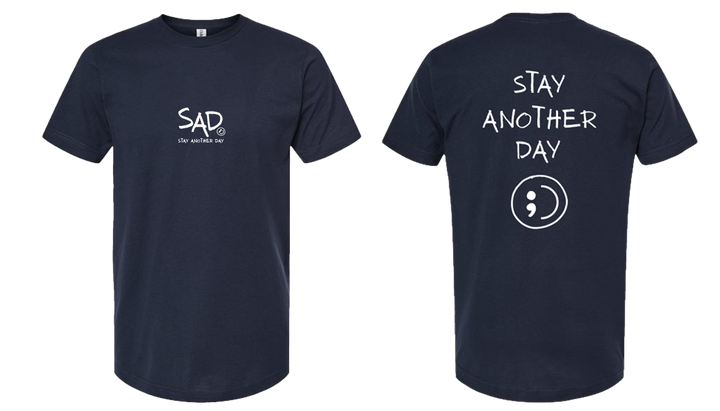 Stay Another Day original navy tshirt. Featuring the smaller SAD - Stay Another Day logo on the front, and the larger Stay Another Day Text on the backside.