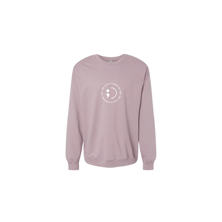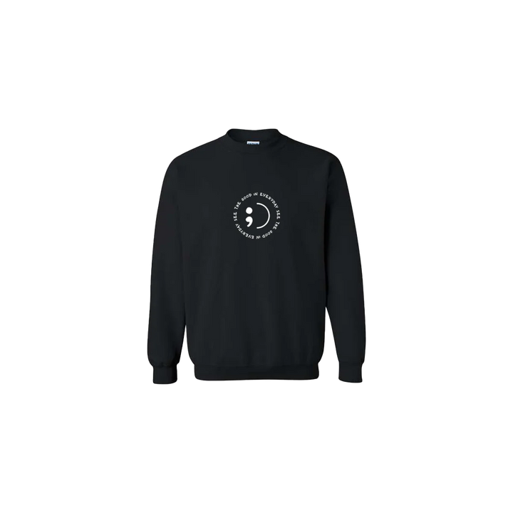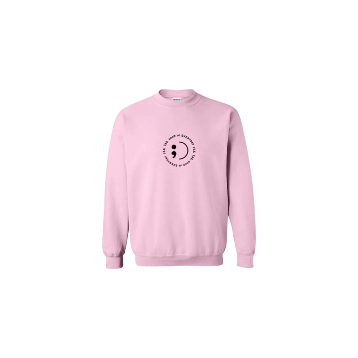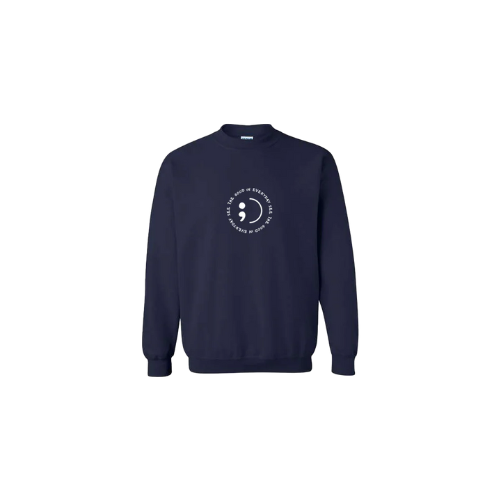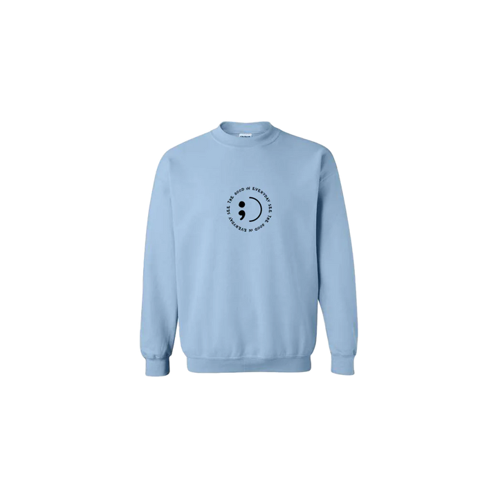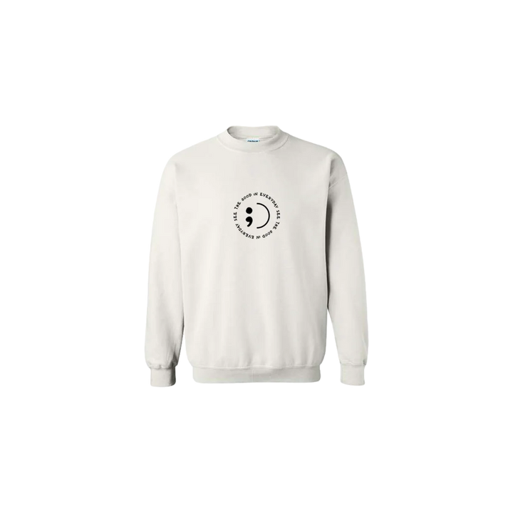 See The Good In Everyday Smiley text Embroidered on a Crewneck. This super comfortable Crewneck features the See The Good in Everday text around semi colon smiley, centered on the front chest.