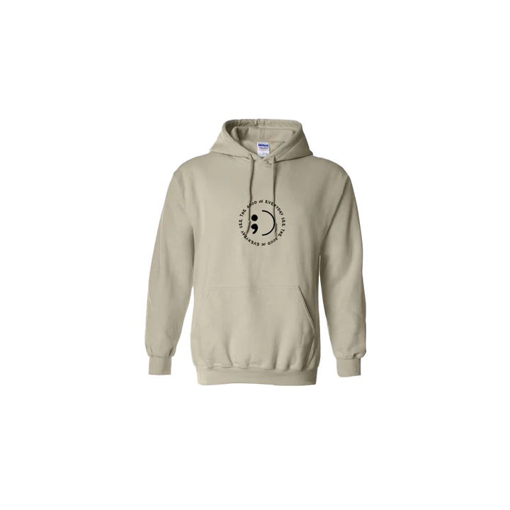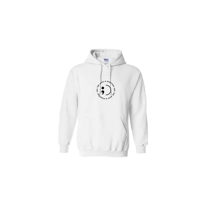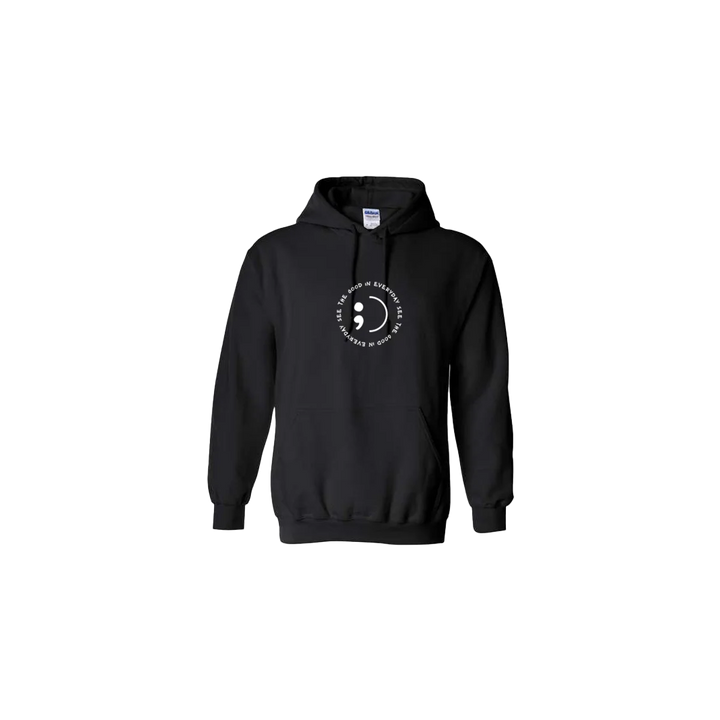 See The Good In Everyday Smiley text Embroidered on a hoodie. This super comfortable hoodie features the See The Good in Everday text around semi colon smiley, centered on the front chest.