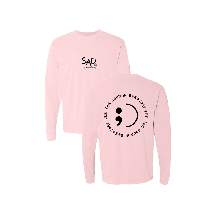 See The Good In Everyday screen printed Pink Long Sleeve Tee. This super comfortable Long Sleeve Tee features the small SAD logo on the front with the Stay Another Day text below, as well as the larger See The Good In Everyday print with text on the back.