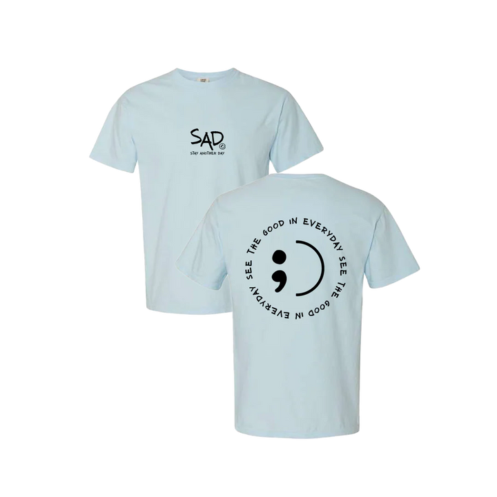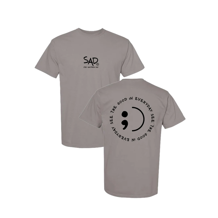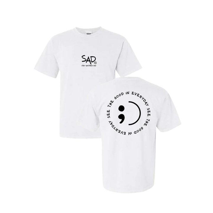 See The Good In Everyday screen printed T-shirt. This super comfortable T-shirt features the small SAD logo on the front with the Stay Another Day text below, as well as the larger See The Good In Everyday print with text on the back.