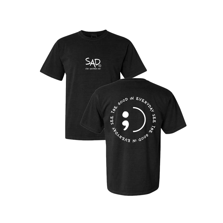 See The Good In Everyday screen printed Black T-shirt. This super comfortable T-shirt features the small SAD logo on the front with the Stay Another Day text below, as well as the larger See The Good In Everyday print with text on the back.