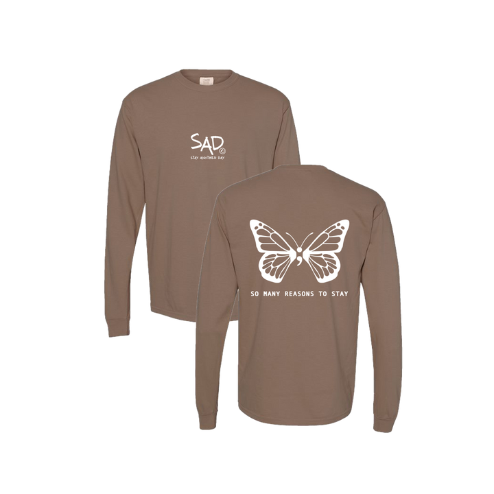 Butterfly with So Many Reasons To Stay text screen printed design Brown Long Sleeve Tee. This super comfortable Long Sleeve Tee features the small SAD logo on the front with the Stay Another Day text below, as well as the larger Butterfly print with text on the back.