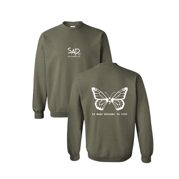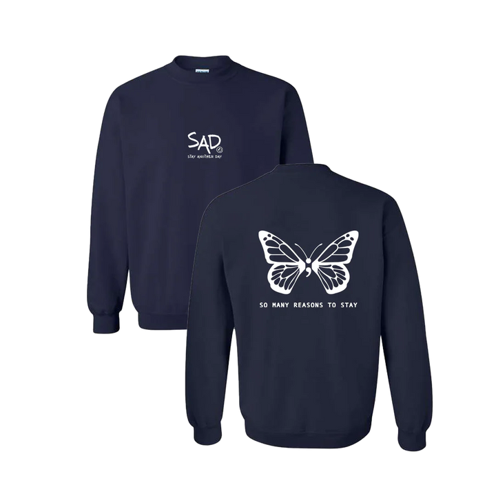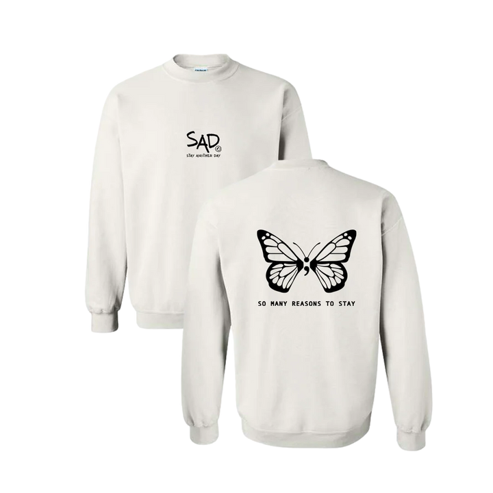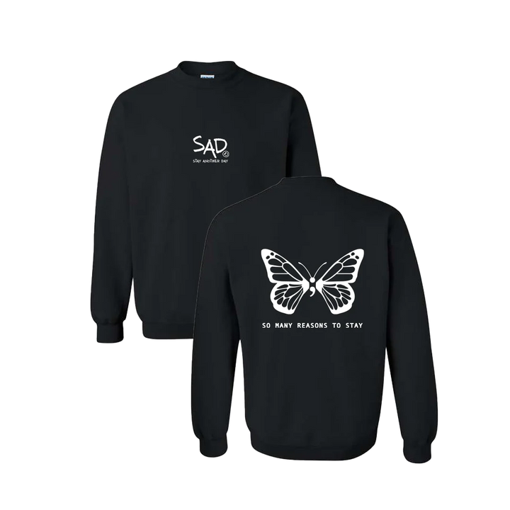 Butterfly with So Many Reasons To Stay text screen printed design Crewneck. This super comfortable Crewneck features the small SAD logo on the front with the Stay Another Day text below, as well as the larger Butterfly print with text on the back.