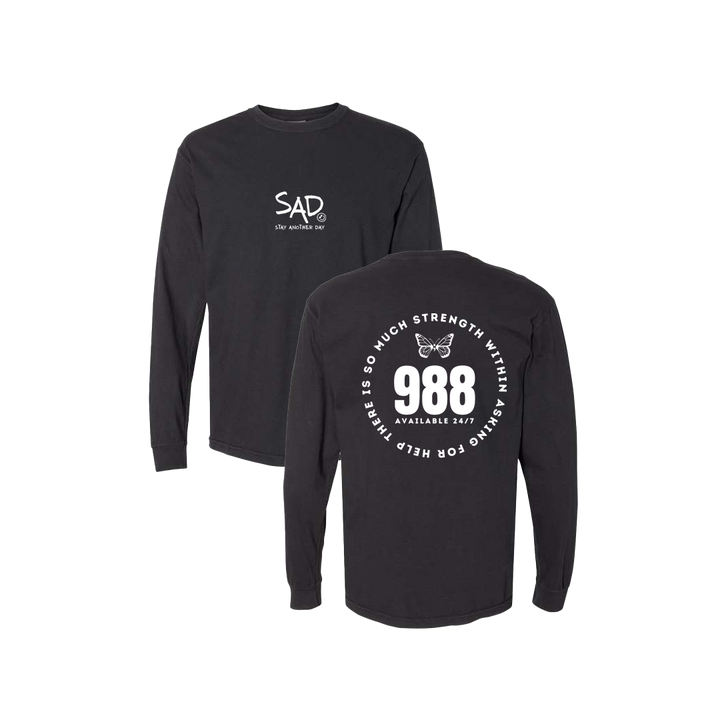 There is So Much Strength Within Asking for Help - 988 - Butterfly - Black T-shirt screen printed design. This super comfortable Long Sleeve Tee features the small SAD logo on the front with the Stay Another Day text below, as well as the large 988 design print on the back.