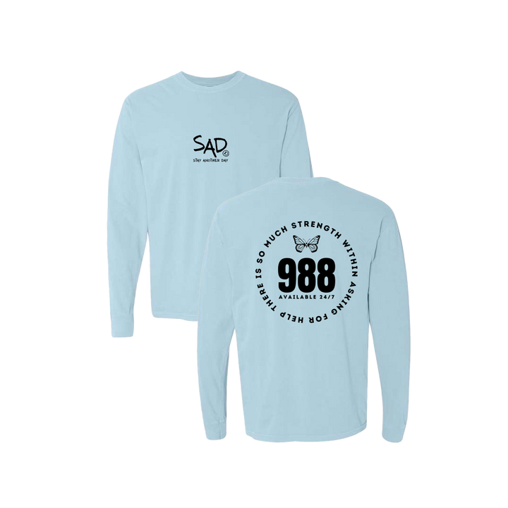 There is So Much Strength Within Asking for Help - 988 - Butterfly - Blue T-shirt screen printed design. This super comfortable Long Sleeve Tee features the small SAD logo on the front with the Stay Another Day text below, as well as the large 988 design print on the back.