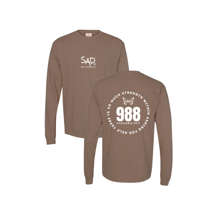There is So Much Strength Within Asking for Help - 988 - Butterfly - Brown T-shirt screen printed design. This super comfortable Long Sleeve Tee features the small SAD logo on the front with the Stay Another Day text below, as well as the large 988 design print on the back.