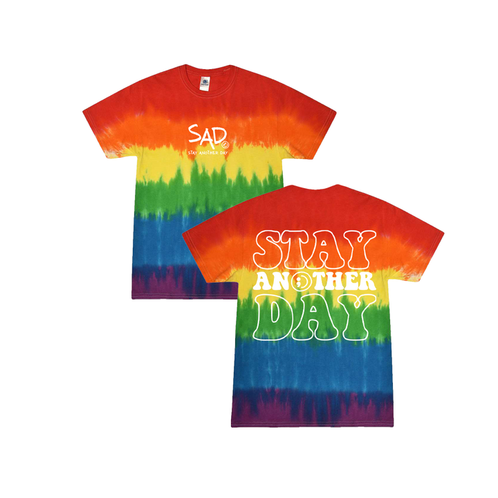 Stay Another Day Bubble Print Tie Dye Pride T-Shirt. This super comfortable crewneck features the Stay Another Day text the front, as well as the larger Stay Another Day White Bubble letters on the back. Available from Small thru 5x
