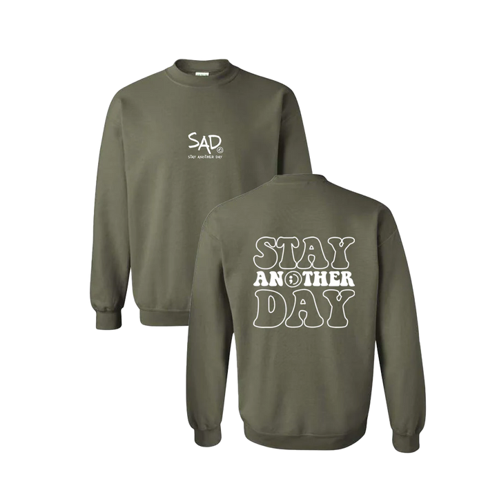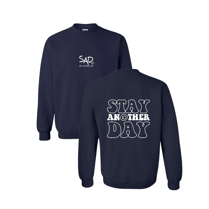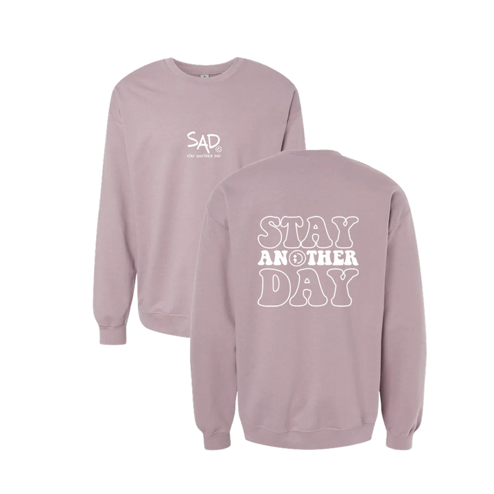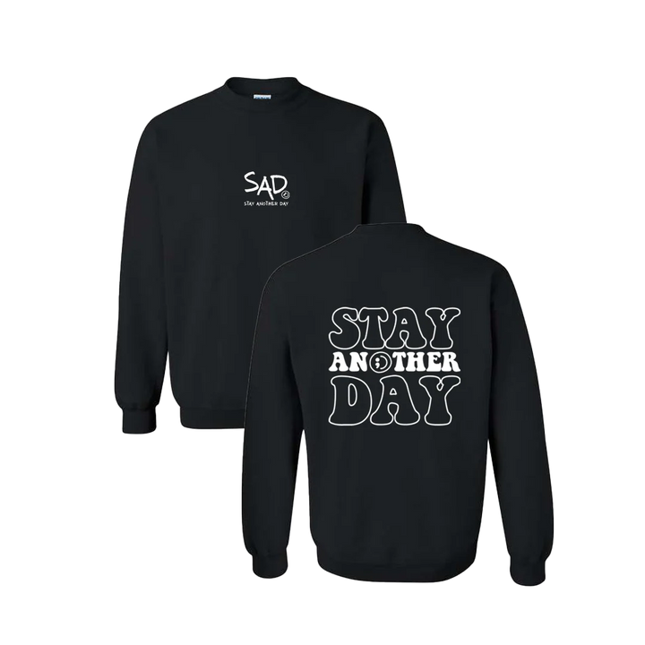 Stay Another Day Bubble Crewneck screen printed design. This super comfortable Crewneck features the small SAD logo on the front with the Stay Another Day text below, as well as the larger Stay Another Day Bubble Print text on the back.