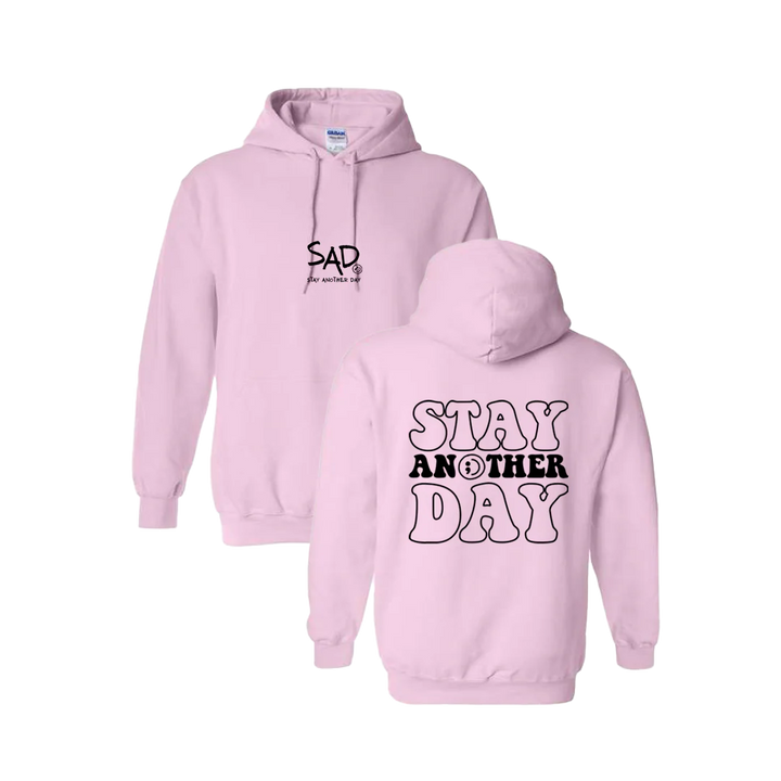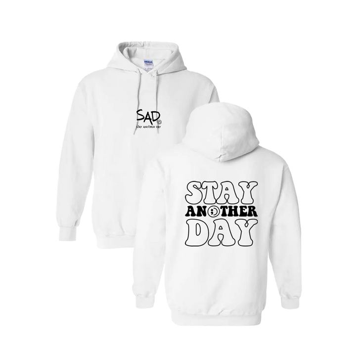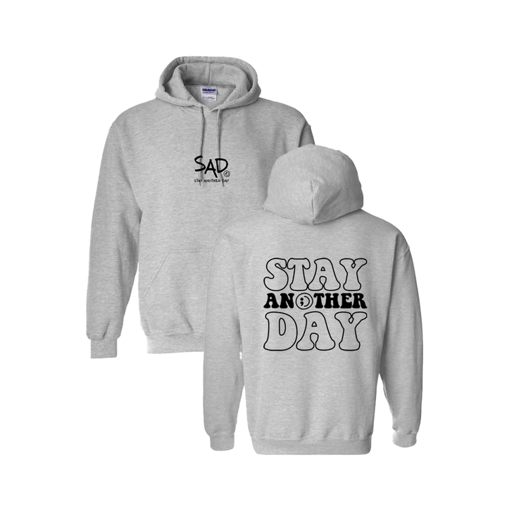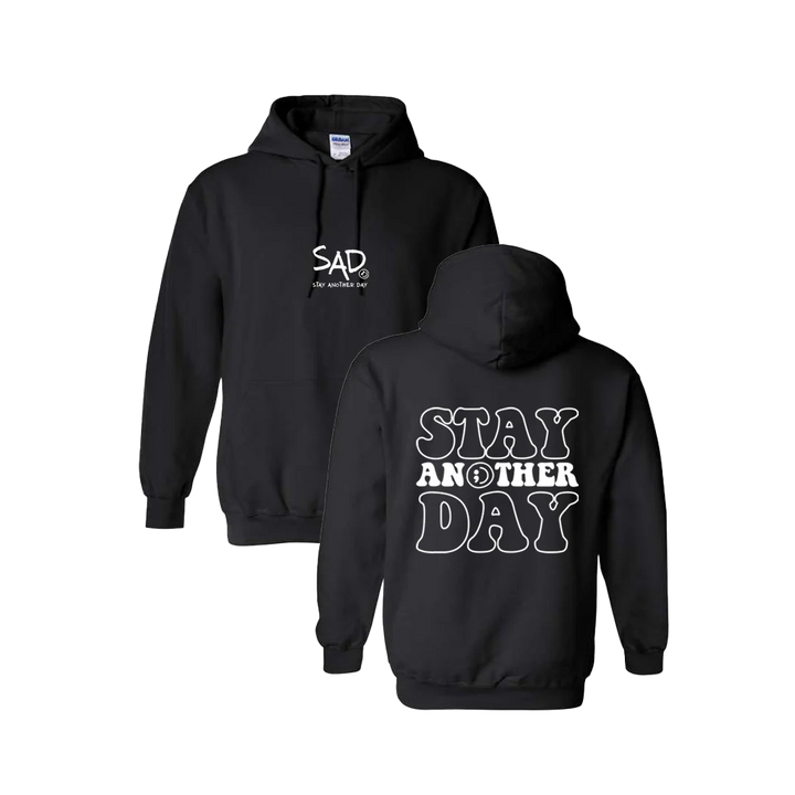 Stay Another Day Bubble Print hoodie screen printed design. This super comfortable hoodie features the small SAD logo on the front with the Stay Another Day text below, as well as the larger Stay Anohter Day Bubble Print text on the back.