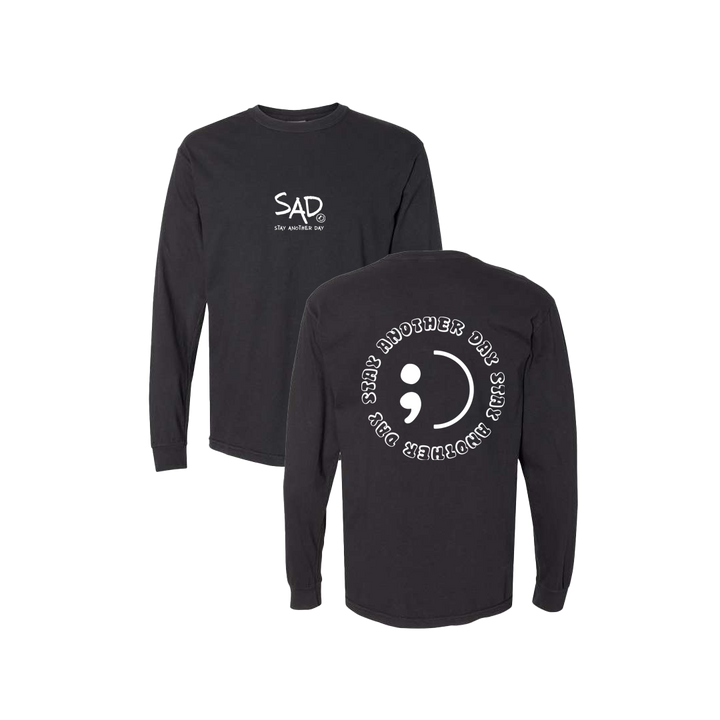 Stay Another Day Circle - Semicolon Black Long Sleeve Tee featuring our original screen printed design. This super comfortable Long Sleeve Tee features the small SAD logo on the front with the Stay Another Day text below, as well as the larger Stay Another Day Logo Circle design with semicolon print on the back.