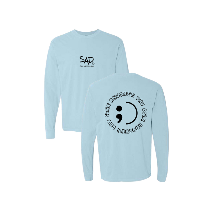 Stay Another Day Circle - Semicolon Blue Long Sleeve Tee featuring our original screen printed design. This super comfortable Long Sleeve Tee features the small SAD logo on the front with the Stay Another Day text below, as well as the larger Stay Another Day Logo Circle design with semicolon print on the back.