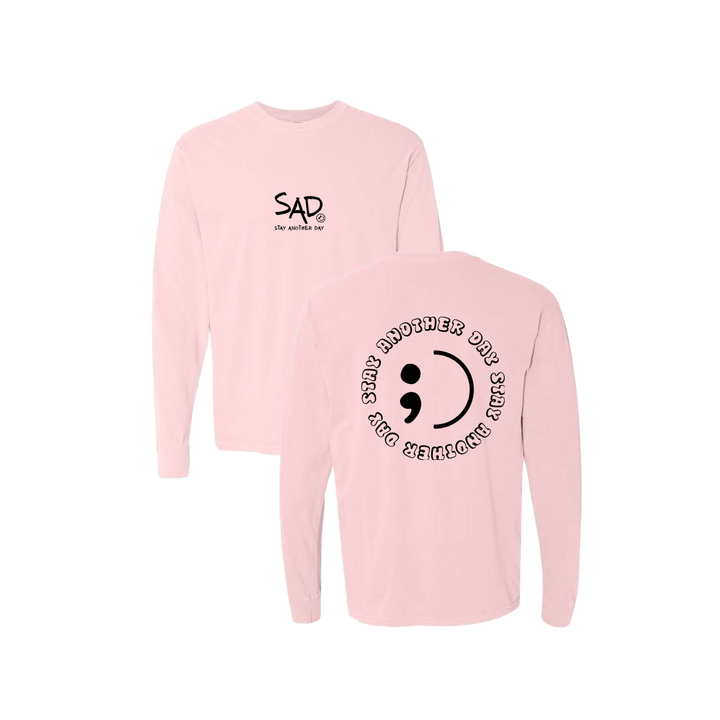 Stay Another Day Circle - Semicolon Pink Long Sleeve Tee featuring our original screen printed design. This super comfortable Long Sleeve Tee features the small SAD logo on the front with the Stay Another Day text below, as well as the larger Stay Another Day Logo Circle design with semicolon print on the back.
