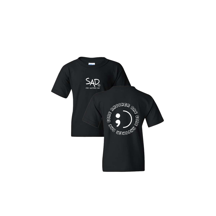 Stay Another Day Circle - Semicolon Black youth Tshirt featuring our original screen printed design. This super comfortable Tshirt features the small SAD logo on the front with the Stay Another Day text below, as well as the Youth Larger Stay Anohter Day Logo Circle design with semicolon print on the back.